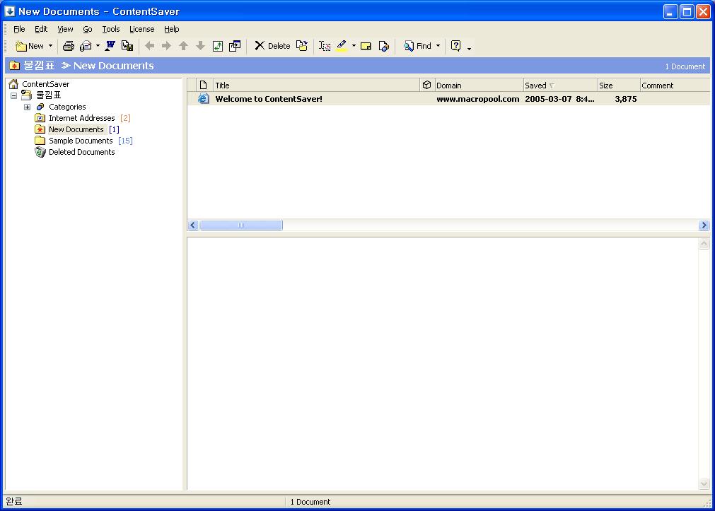 한편 화면의 오른쪽에는 상단에 해당 카테고리/폴더의 문서 목록이 표시되고 아래에는 해당 웹페이지의 내용이 출력되는 브라우저 창이 마련되어 있습니다. 웹페이지의 저장은 ContentSaver를 설치하면 웹브라우저에 자동으로 설치되는 전용 툴바를 사용해야 합니다. 우선 ContentSaver의 File 메뉴에서 New → Save New Web Page를 클릭해 마법사 설정을 따릅니다(이게 상당히 편합니다). 하나의 웹페이지를 저장한다는 위쪽 설정에 체크하고 다음으로 진행하면 익스플로러 창이 하나 뜨면서 상단에 ContentSaver의 툴바가 설치되었다는 표시가 나옵니다. 이 툴바에서는 해당 웹페이지만 혹은 해당 웹페이지와 링크 설정된 다른 페이지들을 한꺼번에 현재 Archive에 저장할 수 있도록 해주며, 아울러 URL을 저장하여 ContentSaver 창에서 손쉽게 해당 페이지를 볼 수 있도록 해줍니다.