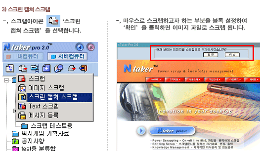 마지막 Ntaker는 앞서 프로그램들과 마찬가지로 웹상에 존재하는 정보(웹 페이지)를 자신의 하드 디스크에 손쉽게 저장하고 편집, 분류, 인쇄할 수 있으며, 저장된 정보의 내용을 검색해 바로 확인까지 가능한 어플리케이션입니다. 이번에 웹 패턴테크놀로지에서 새롭게 버전업해 발표한 Ntaker는 이러한 작업을 매우 편리하게 할 수 있어 웹서핑을 자주하는 사람들에게 매우 유용한 프로그램입니다(사실 위의 두 프로그램도 편하긴 마찬가지지만…).