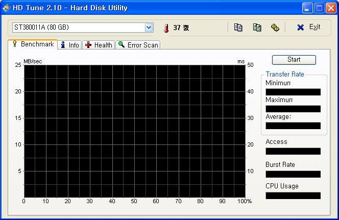 벤치마크(Benchmark) 기능을 수행하면 하드디스크의 내주에서 외주에 이르기까지 데이터의 전송 속도를 검사하여 최고/최저/평균 전송 속도를 알려줍니다. 또한 평균적인 접근 시간(Access Time)이나 CPU 점유율 정도도 알려줍니다. 이런 검사는 디스크 전반에 걸친 것이므로 하드디스크 단위로 일어나며, 파티션의 유무는 상관이 없습니다.