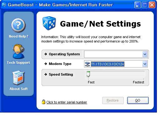 한편 GameBoost는 인터넷 속도관련 설정을 최적화해주기 때문에 최근 각광을 받고 있는 각종 온라인 게임 등의 원활한 수행에 큰 효험을 발휘할 수 있습니다. 14.4/28.8/33.6/56 Kbps 전화 연결 모뎀은 물론 각종 Cable 및 XDSL 모뎀 각각에 대해 최적화 값을 지정해주므로 일반적인 가정용 PC 사용자라면 대부분 효과를 볼 수 있습니다.
