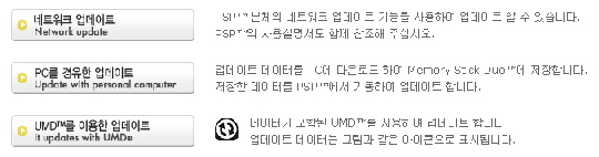 2.0으로 업데이트하는 방법에는 '네트워크 업데이트', 'PC를 경유한 업데이트', 'UMD를 이용한 업데이트' 등 크게 세 가지가 있다. 자세한 방법은 SCEK가 운영하는 공식 사이트(http://www.playstation.co.kr)에 아주 잘 설명되어 있으니 그 쪽을 참고하기 바란다. 참고로 'UMD를 이용한 업데이트'의 경우 아직 이에 대응하는 UMD가 발매되지 않았기 때문에 현재로서는 이용할 수 없다.