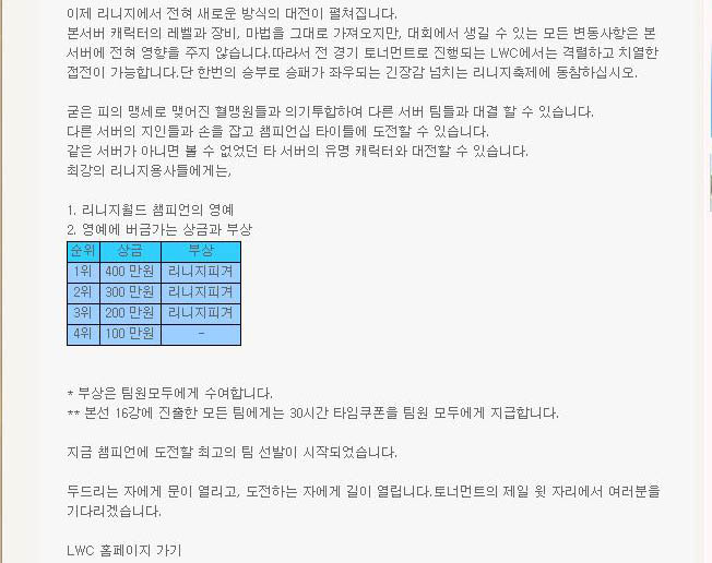 게다가 리니지 공식홈페이지에는 대회의 진행과 관련된 이야기가 거의 올라오지 않았다. 결국 LWC에 관심이 있는 유저라도 대회와 관계된 정보를 얻기 위해서는 총판에 직접 연락하는 수밖에 없는 헤프닝이 벌어지기도 했다.