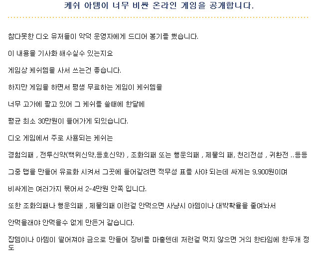 디오는 정액제로 시작했다가 부분유료화로 전향한 MMORPG이다. 당연히 부분유료화로 전환하면서 동네방네에 무료를 선언하고 다녔고, 그와 동시에 캐쉬 아이템샵을 오픈했다. 여기까지는 좋은데 문제는 이 아이템들의 가격이 예사롭지 않다는 것이다.