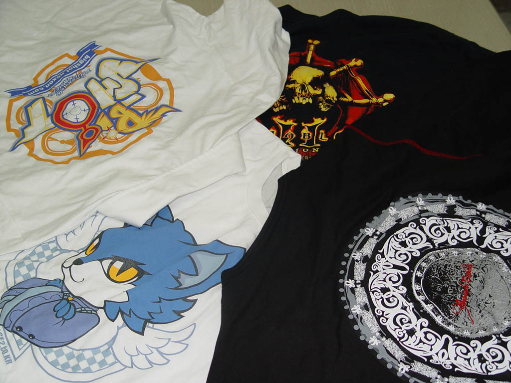 ▲특집기사 한 번 쓰고나니 필자의 책상에 티셔츠가 한 가득 쌓여버렸다. 기사에 사용되지 않은 티셔츠까지 포함하면 무려 25벌. 근데 기사 쓴다니까 공룡왕 티셔츠 놓고 간 사람 누굽니까? 앙? 미소녀 티셔츠까지는 참겠는데 말이지.-_-;; |