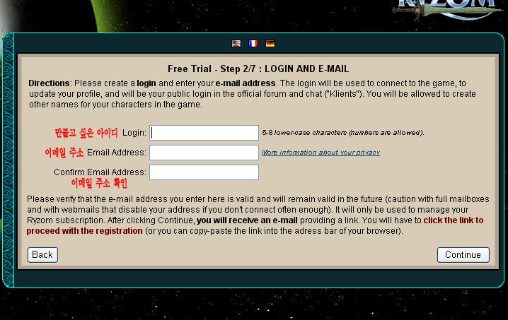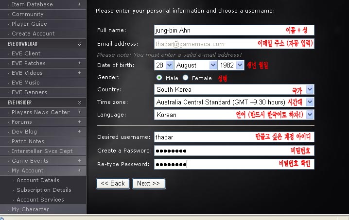 그 후에 신상정보와 사용할 계정을 입력하면 끝난다. 단, 이브온라인의 신상정보 항목에는 시간대와 사용언어를 입력하는 곳이 있는데 시간대야 무엇을 고르든 상관없지만 사용언어만큼은 꼭 한글을 고르도록 하자. 최소한 튜토리얼 만큼은 한글로 즐길 수 있을 테니 말이다.