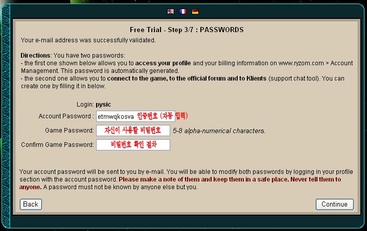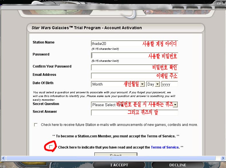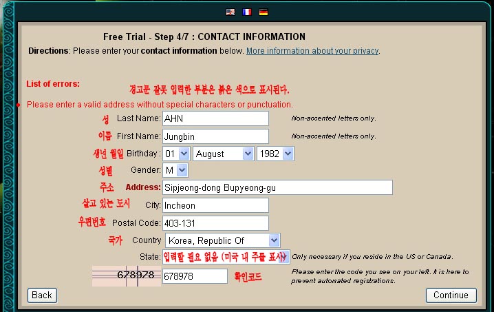 비밀번호까지 쓰고 나면 드디어 계정가입 최고의 난관, 신상정보 등록시간이다! 아마 여기서 헤매는 분들이 많으실 텐데, 실은 허위로 입력해도 큰 상관은 없다. 하지만! 이왕이면 확실히 해주자. 그래야 자랑스러운 대한민국 게이머가 아니겠는가! 다음 그림을 보고 가볍게 입력해주자.