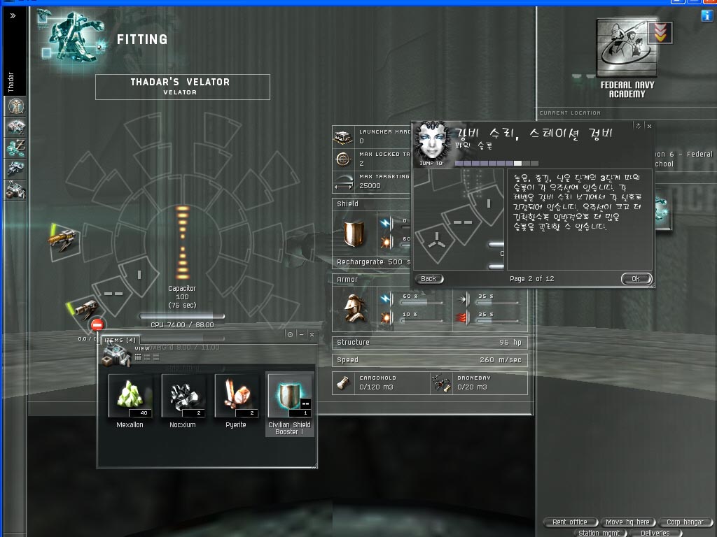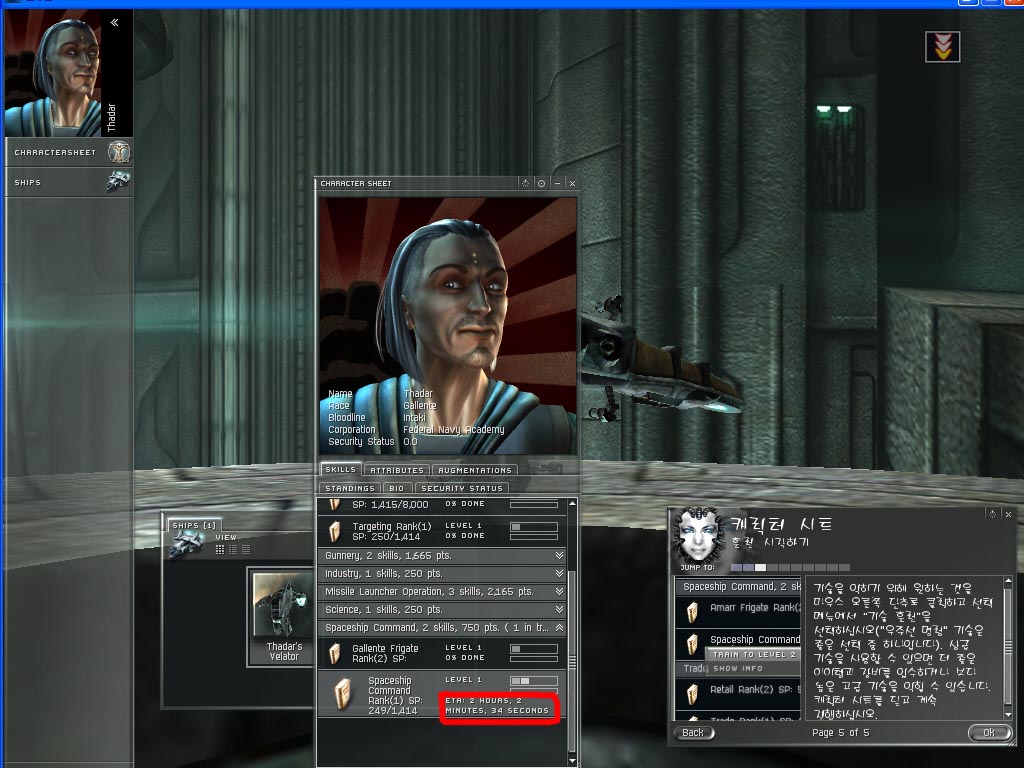 ▲밑의 스킬 창에 주목하자. 2시간 정도 후에 스킬이 올라감을 알 수 있다. 플레이 해보면 알겠지만 이브온라인은 정말로 느긋하다 |