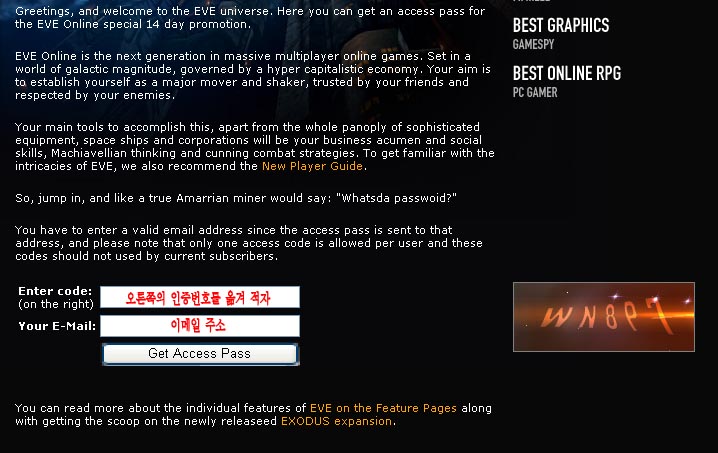 그리고 아래의 두 칸에 오른쪽에 보이는 글씨와 이메일 주소를 적어주면 된다. 물론 그동안 왼쪽의 'EVE Client' 메뉴에 들어가서 미리미리 다운로드를 시작하자.