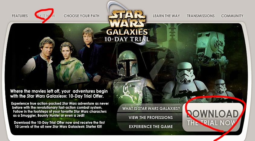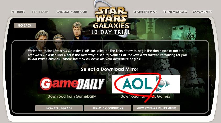 스타워즈 갤럭시의 체험판을 받으려면 먼저 아래의 주소로 이동한 뒤 상단에 있는 TRY IT NOW를 누르자. 그 후 트라이얼 버전 다운로드를 누르면 두 개의 사이트가 뜨는데 오른쪽의 AOL 사이트를 이용하자.