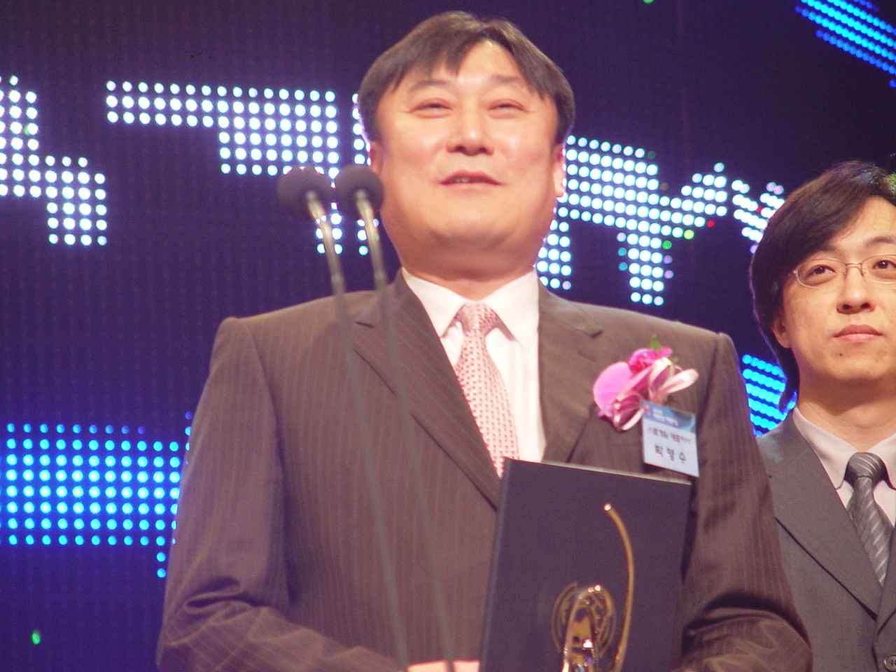 ▲ 엠게임의 박영수 대표는 시상식 내내 상기된 표정을 감추지 못했습니다. 오른쪽 인물은 시상차 나온 작년 대상 수상자 판타그램의 이상윤 대표입니다 |