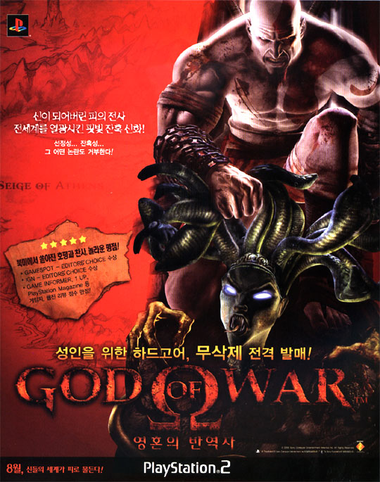 ‘갓 오브 워’는 그리스 신화를 배경으로 2005년 초 발매된 액션게임이다. 발매 후 IGN, 게임스팟 등 해외 웹진의 최고의 액션 게임이란 극찬을 받으며 많은 게이머들을 흥분시켰다. 단순하면서도 화려한 액션, 잡기 공격에 이은 호쾌한 타격은 게이머들의 스트레스 해소에 그치지 않고 스트레스를 완벽하게 날려버릴 액션쾌감을 제공한다. SCEK는 갓 오브 워를 원작의 느낌을 그대로 전달하기 위해 무 삭제로 출시해 많은 팬들의 호평을 받았다.