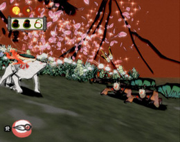 ▲ 수묵화 풍의 독특한 그래픽으로 유명한 오오가미에는 일본이 태양신 아마테라스가 개의 형상으로 등장한다 |
