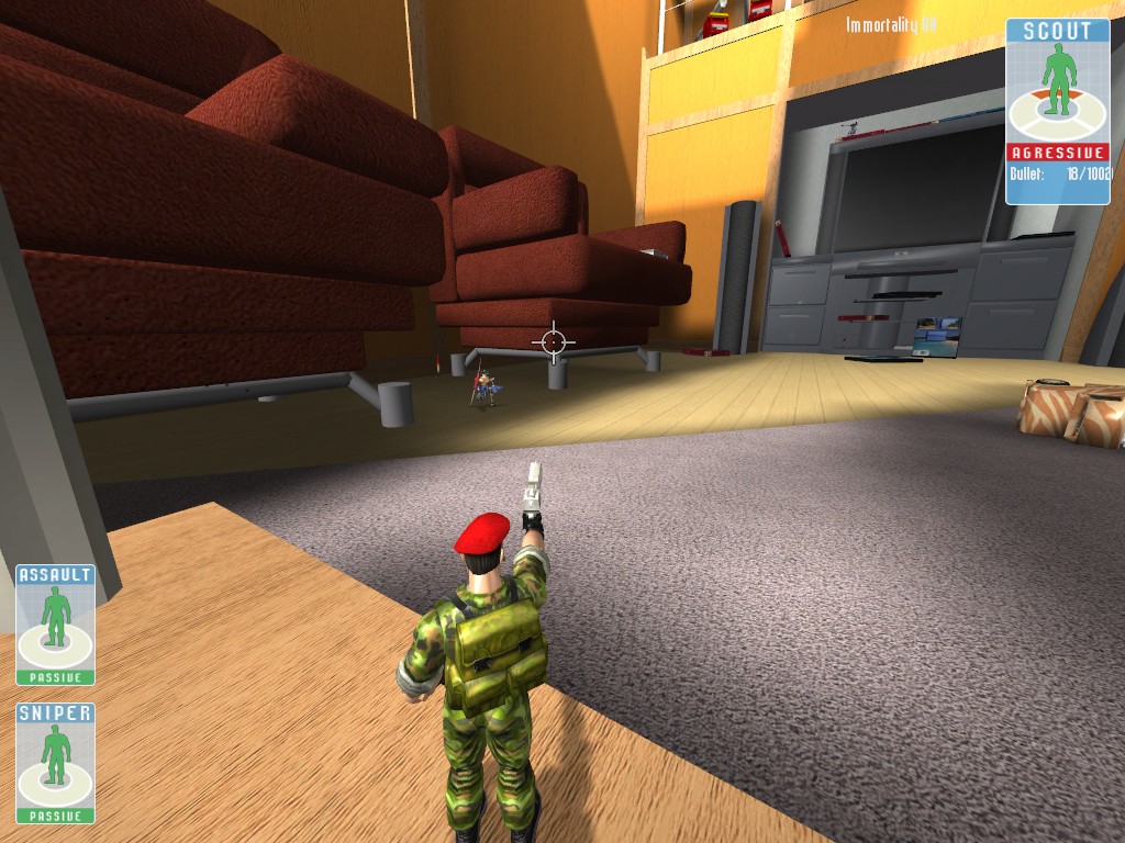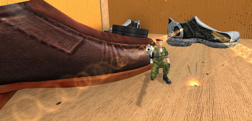 건전지가 딱히 들어가 있는 것도 아닌데, 장난감이 저절로 움직이고, 게다가 자신을 괴롭히기까지 한다면 어떤 생각이 들겠는가? 몬스터라고 소리치며 집밖으로 뛰쳐나가고 싶을 것이다. 예전에도 장난감들을 소재로 한 게임들이 등장한 바 있지만, 이 게임은 분대형 전투를 펼친다는데 더욱 인상적이다. 딱총과 바주카포, 수류탄 등을 사용해 집안을 위협하는 다른 장난감들을 모두 쓰러뜨려라! 집안의 평화를 위해서라면, 장난감도 나서야 한다!! 인상 더러운 장난감들을 향해 헤드샷을 날리는 묘미가 있는 게임이다.