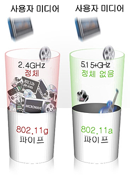 802.11a와 802.11g는 전송속도가 같지만 a는 5.15GHz ~ 5.35GHz의 높은 대역에서 작동하므로 간섭이 적다.