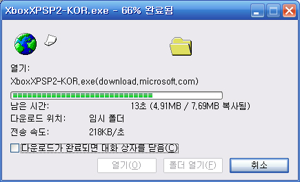 ▲XboxXPSP2-KOR.exe 용량은 7.69MB이며 한글 윈도우XP 서비스팩 2에 설치할 수 있다