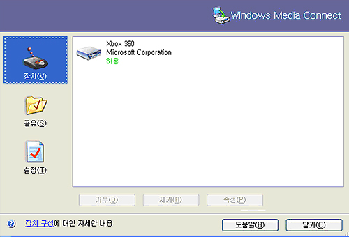 윈도우 미디어 커넥터는 크게 3가지 부분으로 구성된다. Xbox360뿐만 아니라 다양한 장치에 대한 연결을 설정해주는 프로그램이니 먼저 장치 탭을 선택하여 Xbox360의 접근 권한을 부여해야 한다