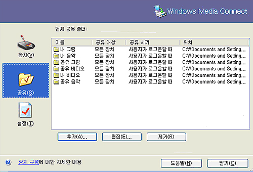 7. 이제 PC에서 어떤 폴더를 공유할지 설정한다. [추가] [편집] [제거] 버튼을 이용하여 PC에 있는 폴더를 공유시키자
