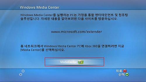 2. 화면에 윈도우 미디어 센터를 이용한 네트워크 연결에 관해 간단한 안내문구가 출력되며 아래쪽에 지금 연결할 것인지를 묻는 버튼이 출력될 것이다. 컨트롤러를 이용해서 아래쪽의 버튼을 선택한다