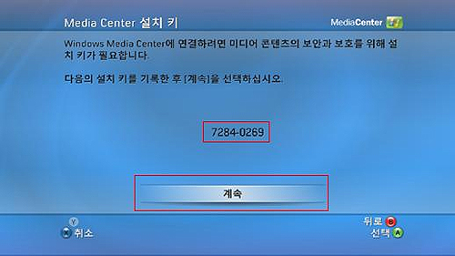 4. 윈도우 미디어 센터 PC가 검색되면 화면상에 보안을 위한 설치 키가 표시된다. 이 키를 메모한 후 계속을 선택한다. 연결할 윈도우 미디어 센터 PC를 이용하여 화면에 안내되는 사이트 (http://www.xbox.com/pcsetup)을 방문하여 PC측에 필요한 파일들을 설치한다