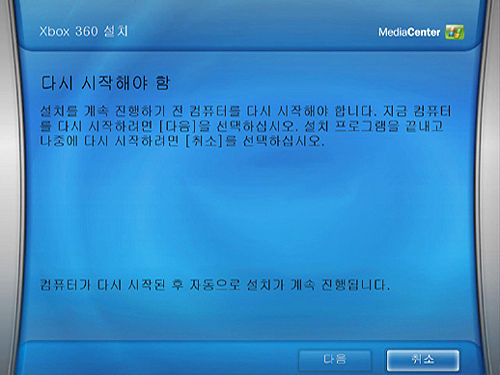 4. 미디어 센터 익스텐더의 설치가 완료되면 PC를 다시 시작하여 다음 단계로 진행할 수 있다. [다음] 버튼을 클릭하면 PC가 재부팅된다. 재부팅 된 이후 별도의 조치를 취하지 않아도 자동으로 설치가 계속될 것이다