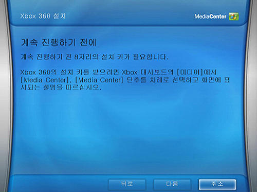 사이트(http://www.xbox.com/pcsetup)를 방문하면 하단에 [SETUP]버튼이 보인다. 이 버튼을 누르면 자신의 컴퓨터가 윈도우 미디어 센터 PC인지, 혹인 서비스팩 2만 설치된 PC인지에 따라 자동으로 설치 프로세스가 변경될 것이다. 중간에 아까 적어둔 보안 설치 키를 물어보니 입력하자.