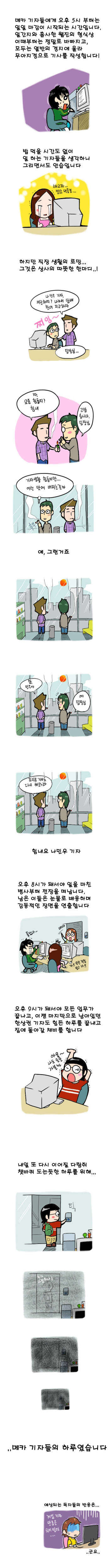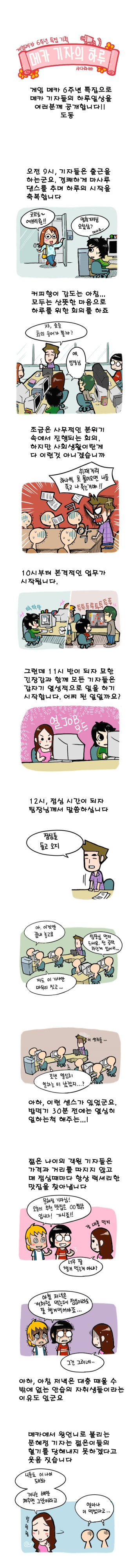 →잠깐! 명색이 특집기사인데 여기서 끝난다면 아쉽지 않습니까? 다음 페이지에는 게임메카 기자들의 하루를 낱낱히 파헤친 초!특!급! 카툰이 기다리고 있습니다. 이런, 지금 나가려는 당신! (3)페이지 11번째 그림의 당사자가 될지도. 후후...