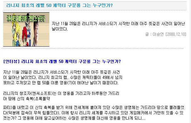 2000년 12월, 게임메카 사이트에 갑자기 난리가 났습니다. 리니지 최초로 레벨 50을 달성한 주인공의 인터뷰 기사가 실린 것!