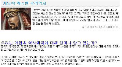 이 기사는 중국, 대만, 일본 게임들을 대상으로 '환상삼국지'에서 사악한 악마로 묘사된 치우천황, 국내 온라인 게임 '시아'가 중국으로 수출되면서 바뀐 배경 스토리(중국 시아에서는 치우천황이 악마에게 현혹되어 전쟁을 일으키는 악의 화신으로 등장), '징기스칸 4'에서 변방의 약소국으로 묘사된 고려 등 게임 속에서 왜곡된 우리 역사를 낱낱히 보여주었죠.