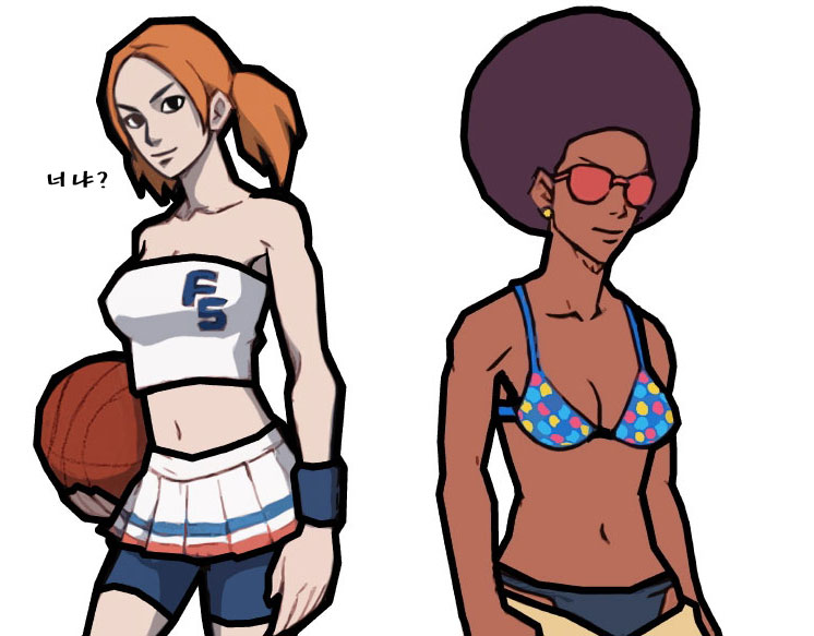 프랑스인인 엘레나를 비롯한 서양계의 캐릭터들은 좀 더 과감하게 가슴의 계곡을 강조하면서 끈이나 강렬한 무늬가 들어간 비키니 차림을 하고 있습니다. 문화적 차이 일까요, 신체적 차이일까요. 카스미나 레이팡 같은 동양계 캐릭터는 같은 비키니라도 가슴이나 다리보다는 귀여움에 중점을 둔 밝은 색의 비키니를 즐겨 입습니다.