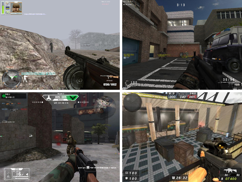 ▲ 빠르게 진화하는 국내 FPS 게임들(왼쪽 위부터 시계 방향으로 카르마 온라인, 스페셜포스, 워록, 헤드샷 온라인). |
