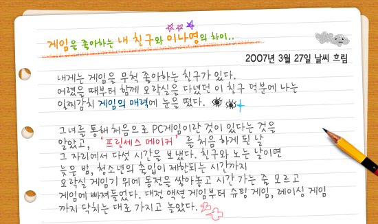 게임을 좋아하는 내 친구는 보통의 여자애라면 바비 인형을 가지고 놀았을 나이부터, 게임을 좋아했고, 지금도 몹시 좋아한다. 그것도 여자로서는 드물게도 비디오 게임 마니아. 보통의 여대생도 즐겨 하는 게임이 되어버린 ‘카트라이더’, ‘오디션’ 같은 게임도 그녀에게는 관심 밖이다. 온라인 게임 계정은 만들 줄 알아도, 일주일 이상 즐기는 것은 보기 힘든 일이다. 여전히 그녀는 비디오 게임기 소프트웨어를 잔뜩 쌓아놓고, 가끔은 ‘국전’을 헤매며 중고 게임소프트웨어를 사들이고 있다.
