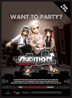오디션의 포스터는 주로 춤을 추는 아바타들의 깜찍하고 발랄한 모습을 보여준다. 이때, 눈여겨볼만한 부분이 아바타 캐릭터들의 의상이다. 예당 온라인 측은 겨울이 없는 동남아시아의 기후적 특성을 반영해, 겨울의상을 입은 아바타는 넣지 않는다고 설명했다.