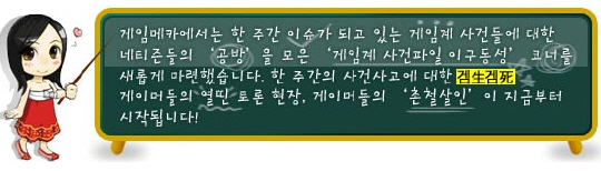 안녕하세요. 매주 '게임계 사건파일 이구동성'을 통해 여러분의 목소리를 담고 있는 게임메카 문혜정 기자입니다. 오늘은 자유롭게 게임메카 유저들과 소통할 수 있는 '메카 블로그' 코너를 통해 게임메카 유저들에 대한 개인적인 견해를 써볼까합니다(악플다셨던 분들 기대하십시오! 후후) 전 1년 전까지만 해도 온라인게임잡지 넷파워의 ‘미카짱’이라는 닉네임으로 더 잘 알려진 게임계에 몇 없는 여기자 중 한명이였습니다. |