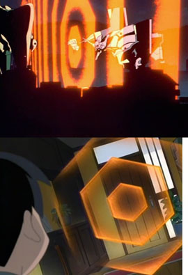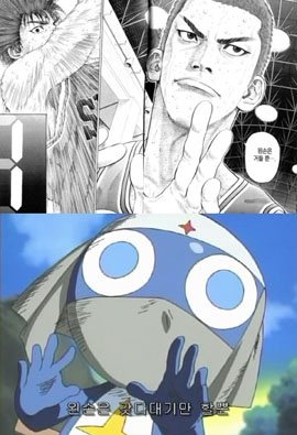 ▲ 슬램덩크 패러디(좌), 에반게리온 AT필드 패러디(우) 특히, 슬램덩크를 흉내내는 장면에서는 도로로의 목소리를 강백호의 성우가 직접 내는 등 패러디의 맛을 한층 더 살렸다. |