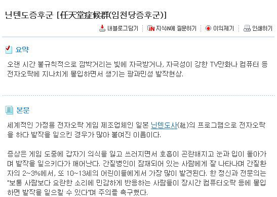 한국에서도 1993년 1월에 환자가 처음 발견되었으며, 1999년 2월에는 13세 때 처음 컴퓨터 오락을 하다 발작을 일으킨 후 컴퓨터오락에만 매달리면 발작증세를 보여 의사의 진단을 받고 휴학 중이던 대학생이 숨진 사고도 발생했다.]-네이버 백과사전 발췌