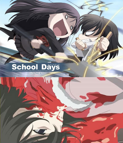 하지만 이런 것들 다 재껴두고, 가장 화려하게 장식한 작품이 있었으니, 바로 ‘스쿨데이즈’다. 성인 미소녀 게임으로서 원작 역시 게임 전체가 풀 애니메이션으로 만들어져 방대한 영상을 자랑했는데, 이런 이 게임 앞에 붙는 수식어가 있다. ‘고어물(gore:《문어》 (상처에서 나온) 피, 핏덩이, 엉긴 피, 응혈(凝血)라는 수식어를 합쳐서 만들어진 괴기물을 뜻함)’이다.