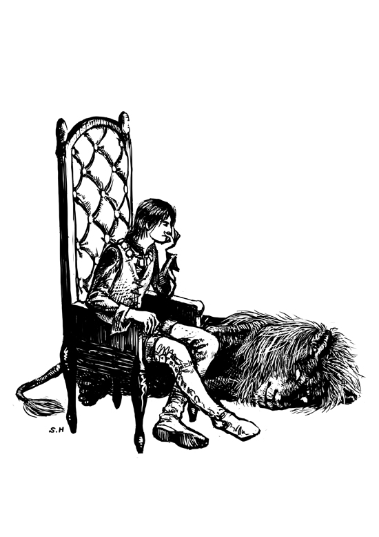 검푸른 비단으로 지은 셔츠에 사슴 가죽 바지와 조끼를 입고 금과 에메랄드로 장식된 목걸이를 건 아름다운 왕자였다. 왕의 첫 번째 아들이자, 왕비의 사랑스런 외아들인 왕자는 당당한 위엄과 힘을 드러내며 왕의 발치에 사나워 보이는 검은 사자를 내려놓았다.