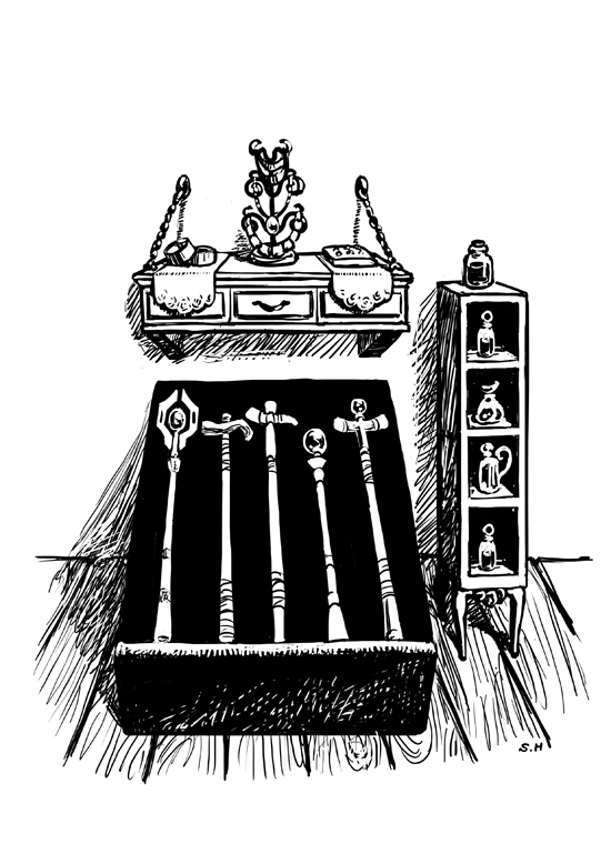 검은 비로드 상자 위로 별처럼 반짝이는 막대기들이 줄지어 누워 있었다. 지팡이라 부르기엔 조금 짧고 아니라 하기엔 그 쓰임새가 모호하다. 재료도 각각이라 나무로 만든 것이나 금속으로 만든 것 등 가지가지였다. 하지만 모두 크고 작은 수정들이 박힌 모습이 자못 아름다웠다. 그 외에도 반지나 목걸이들이 나란히 전시되어 있었다.
