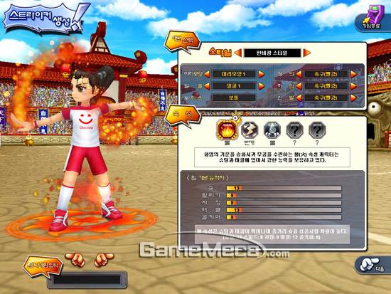불 속성은 슈팅과 태클이 뛰어나고, 번개 속성은 스피드와 차징, 물 속성은 평균적인 능력치를 가지고 있다. 물음표로 표시 되는 두 칸의 슬롯은 앞으로 두 가지 캐릭터와 속성이 등장할 것이라는 암시를 주고 있다.