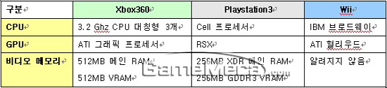 Wii 의 큰 단점 중 하나는 PS3, Xbox360 보다 낮은 성능이다. Wii의 성능은 이전 세대 콘솔게임기인 PS2나 Xbox, NGC의 성능과 비슷한 수준이다. 다른 게임기에 비해 낮은 Wii의 성능은 Xbox360이나 PS3의 게임을 완전하게 이식하는 것이 불가능하다. 일단 성능 비교를 보도록 하자.