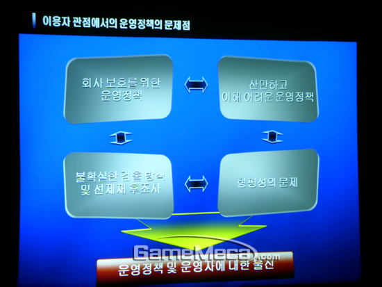운영정책의 문제점과 대안을 제시했던 강연자 박재훈 팀장도 게이머의 관점에서 바라본 운영 정책의 네 가지 문제점을 꼬집었다. ▲회사 보호를 위한 운영정책 ▲산만하고 이해하기 어려운 운영정책 ▲불확실한 검출 방식 및 선제재 후조사 ▲형평성의 문제였다. 이는 제대로 된 시스템을 갖출 수 없는 신생개발사나 소규모 개발사에 이르면 더욱 문제는 심각해진다.