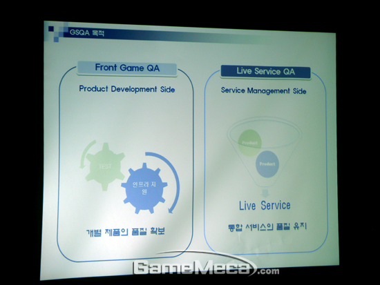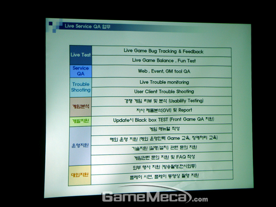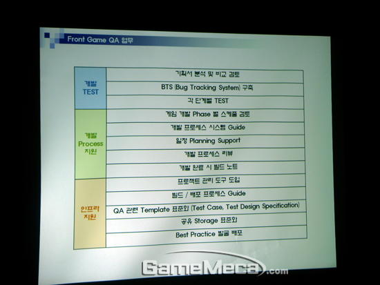 강연자로 나섰던 SK미디어 정웅모 팀장은 “대부분의 게임 개발이나 운영에서 문제가 발생하는 것은 메인 업무가 아니라 이른바 ‘사이드잡’에 해당하는 사소한 부분에서 발생하는 공백이다. QA는 그런 부분에서 윤활유와 같은 ‘버프’ 역할을 해준다.”고 설명했다.