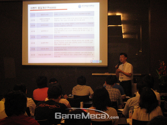 간단한 개회식과 게임물 등급분류에 관한 초청강연을 듣고 각자 원하는 세미나로 발걸음을 옮겼다. 내가 선택한 것은 운영과 QA 파트에 해당하는 두 개의 세션이었다. 네 가지 파트에 나누어진 여덟 개의 파트가 있었지만, 동 시간에 진행되는 세미니라 들을 수 있는 것은 두 개뿐이었다. ‘현업에서 보는 운영정책의 문제점’과 ‘About Game QA’를 주제로 개발부터 서비스까지 QA의 역할에 대해 조목조목 짚어주는 내용이었다.