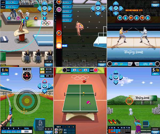 모바일계로 넘어오면 일단 지오인터랙티브에서 출시된 ‘공식 모바일 게임’인 ‘2008 베이징올림픽’ 이 눈에 들어온다. 요새는 공식 모바일 게임까지도 나오는 세상이라는 사실에 새삼 놀라게 된다. 육상, 수영, 양궁 사격, 역도, 기계체조, 다이빙, 탁구, 펜싱 등 총 9개 종목의 18개 경기로 구성되어 있다. 무슨 말인고 하니 육상 같은 대표종목이 한 개의 게임으로 되어있는 것이 아니라 100미터, 200미터, 허들 등으로 세분화 되어있다는 이야기이다. 역시 버튼 연타에 약간의 조작이 가미되어 있는 방식이었다. 한국에서 직접 개발한 올림픽 공식게임은 이번이 처음이라고 한다. 한국대표팀으로 금메달을 따면 애국가가 울린다. 베이징 하늘에 태극기를 날리며 젖어드는 이 감동!