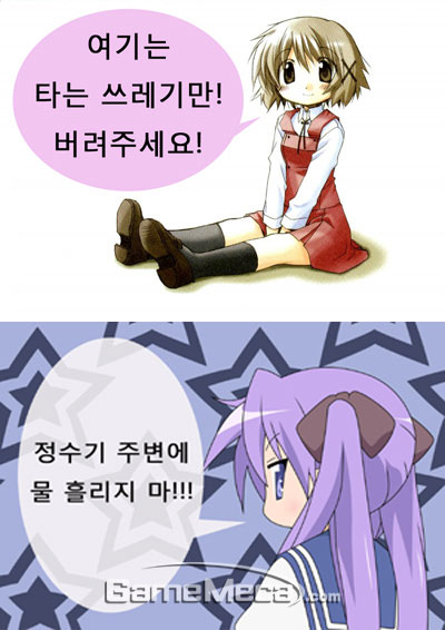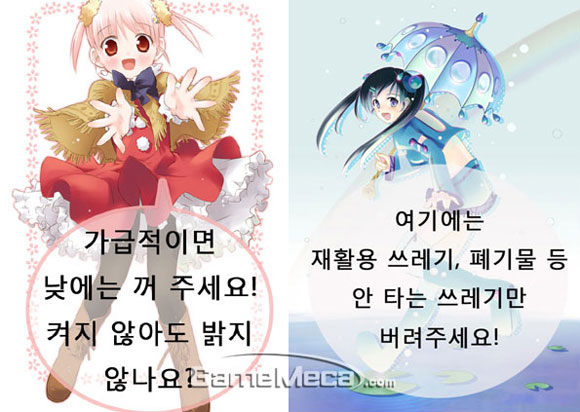 이것들은 모 부대에 실제로 있는 시설물 안내표지입니다. 한 병사가 실제 사용 목적으로 휴가 나와서 인쇄 해 들어갔다고 하네요. 이런 안내표지가 분리수거용 쓰레기통에, 조명스위치에, 정수기에 각각 붙어있다고 생각해 보세요. 물론 그 선임이 제대한 뒤에는 없어질 게 뻔하겠지만, 공공 시설물에 미소녀 일러스트가 붙어 있는 것이 그냥 보고 싶었던 건지도 모르겠네요.