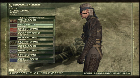 다음 영광의 수상자는 바로 패션계의 원로 스네이크 옹이다. 스네이크 옹의 아버지 빅 보스 옹께서 몇벌의 군복을 군장 속에 꾸려가지고 다니며 수시로 탈의한 것과는 달리 스네이크 옹은 최첨단 과학의 세례를 받아 모든 패션을 한 벌로 모든 것을 끝낸 멋쟁이 되겠다. 그가 착용하고 있는 옥토카모슈트는 접촉하고 있는 것의 형태로 변신이 가능하여 스네이크 옹에게 상황에 따른 환복의 번거로움을 획기적으로 줄여준 옷이다.