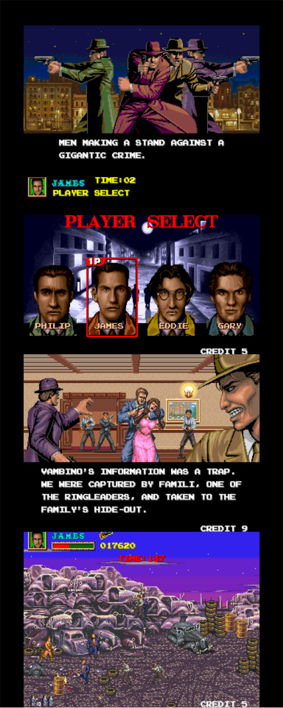 ‘타이토’에서 만든 느와르 액션 게임. 네 명의 카리스마 넘치는 중년 중 한 명을 선택하여 플레이 하는 게임으로 필자는 개인적으로 ‘제임스’를 주로 했다. 필자 집 근처 오락실이 5군데가 있었는데 이 게임은 그 중 딱 한 곳에 있었다. 게다가 돈은 없고 게임 난이도가 상당히 높아서 손가락 빨며 구경만 했던 기억이 있다. 게임 내에서 캐릭터들은 중년이고 뭐고 총알을 피하기 위해 뛰어 다니기 바쁘지만 그림에 중후한 멋이 있었다.’ 느와르 액션 = 멋진 중년’의 이미지가 잘 어울린다고 필자는 생각한다. 풋내나는 청년보다 멋진 중년의 활약이 눈부셔서 기억나는 게임 중 하나이다.