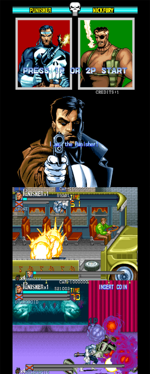 90년대 여러가지 수작을 내놓은 ‘캡콤’. 그 중에서 ‘퍼니셔’라는 게임은 가족을 잃은 분노로 범죄 조직에 맞서는 ‘퍼니셔’와 ‘닉 퓨리’의 복수극을 그렸다. 이 게임에서 가장 볼만한 것은 사실 중년의 두 남자가 펼치는 액션이다. 다양한 무기(총, 칼, 야구배트 등)와 점프 후 ‘수류탄 던지기’는 이 게임의 백미다. 난이도는 어려운 편이지만 필자가 즐겨 했던 게임이다. 바로 위에 소개한 ‘배틀 커넥션’과 비슷한 복수물이지만, 퍼니셔가 근육질 중년의 느낌을 더욱 잘 살린 게임이라고 생각한다. 특히 ‘마벨 카툰’의 느낌을 잘 살린 게임이므로 ‘마벨 시리즈’의 팬에게 추천하는 바이다.