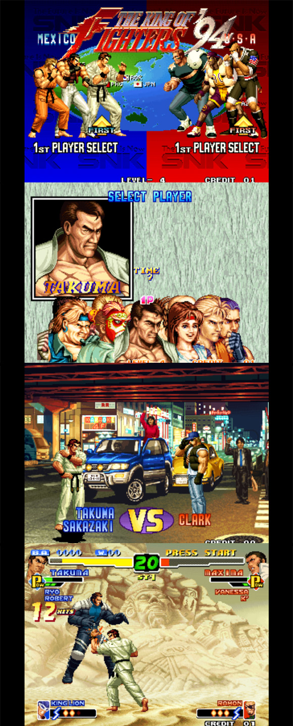 ‘용호의 권1’에서 ‘미스터 가라데’로 등장한 이후, ‘킹 오브 파이터즈’와 ‘용호의 권’ 시리즈에서 활약하고 있는 ‘타쿠마 사카자키’. 중년 캐릭터임에도 불구하고 시리즈마다 강력한 카리스마(다른 의미로는 주책)를 내세워서 추종자가 많다. 필자는 개인적으로 ‘킹 오브 파이터즈 2000’에서 등장한 ‘타쿠마’를 가장 높게 평가한다. 강력하면서도 중후한 멋을 풍긴다. 설정상 아들 하나, 딸 하나를 둔 아버지이지만, 젊은이들에게 지지 않은 패기는 누구에게도 뒤지지 않는다.