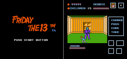 ‘13일의 금요일’이라는 게임은 동명의 영화를 소재로 한 게임으로 1989년 ‘패미컴’으로 발매되었다. 그런데 이 게임은 ‘제이슨’ 같이 생긴 녀석이 적으로 등장해서 주인공들이나 아이들을 습격한다는 점 외에는 원작과 거의 관계가 없는 액션(?) 게임이다. 플레이어는 ‘제이슨’에게 습격 받는 사람들을 보호하고 최종적으로 ‘제이슨’을 때려 잡아야 한다. ‘제이슨’은 좀 쌔긴 하지만(주인공이 약한 걸지도) 보통 게임에 나오는 녀석들과 다를 바 없는 캐릭터로 굳이 ‘제이슨’이라고 할 필요가 있었는가 싶다.